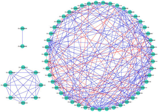 Co-expression networks of the 64 differentially expressed R2R3-MYB genes in pecan after grafting. The blue line color represents positive correlations, and red represents negative correlations. The co-expression networks were visualized using Cytoscape software.
