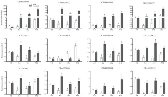Based on the co-expression networks (Figure 7), 12 pecan R2R3-MYB genes that co-expressed with more than 10 nodes were selected and further analyzed using quantitative real-time PCR (qRT-PCR). Surprisingly, the qRT-PCR results revealed that most genes displayed different expression patterns between scion and rootstock samples close to the graft interface (Figure 8). For example, CIL0893S0173 was significantly up-regulated in rootstock samples close to the graft interface, however, it was down-regulated in scion samples. In rootstock samples, ten of the 12 genes were up-regulated; only CIL1141S0028 was slightly down-regulated at 30 d after grafting, and CIL1602S0010 did not exhibit significant expression changes at each of the four timepoints. However, only three genes, namely, CIL0092S0006, CIL0990S0073 and CIL1141S0028, were up-regulated in rootstock samples, and the other nine genes were down-regulated. The hormone response-related cis-elements of 12 R2R3-MYB genes were investigated, and multiple hormone response-related cis-elements were found, including ABRE, CGTCA-motif, P-box, TATC-box, TCA-element and TGACG-motif, suggesting these genes may be involved in the hormone signaling pathway (Figure S6).