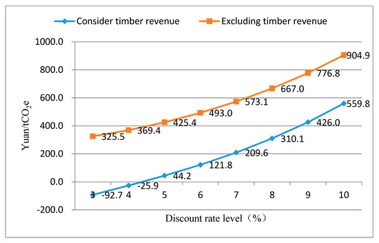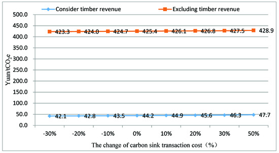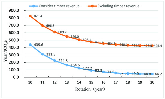 - During the project operation, as the rotation period increases, the carbon sequestration costs of the P. elliottii afforestation project showed a downward trend. When the value of wood is considered, the costs reach the lowest at the best rotation of the 20th year, and the carbon sink costs is 44.2 yuan/tCO2e. When the value of timber is not considered, the carbon sequestration costs decreased from 825.4 yuan/tCO2e in the 10th year to 425.4 yuan/tCO2e in the 20th year, a decrease of 48.4%.