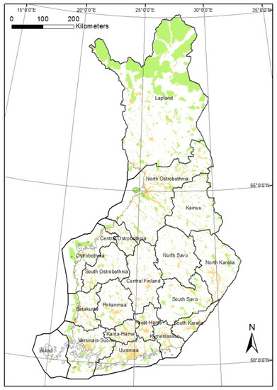 - Natural Resources Institute Finland. Statistics Database: Protected Areas, Biodiversity Conservation Sites in Commercial Forests, and Areas Supporting Conservation of Nature Values, by Region (1000 ha). 2019. Available online: http://statdb.luke.fi/PXWeb/pxweb/en/LUKE/LUKE__04%20Metsa__02%20Rakenne%20ja%20tuotanto__04%20Metsien%20suojelu/02_metsien-suojelu.px/?rxid=001bc7da-70f4-47c4-a6c2-c9100d8b50db (accessed on 18 April 2020).