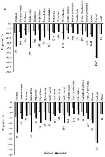 The proportion of (a) area with restrictions on forest management and (b) volume of the growing stock in the areas with restrictions on forest management in OthersE and ProbableE in different provinces in Finland. The numbers below the bars represent the total area (million ha−1) of forest land and the volume (million m−3) of the growing stock in forest land in each province in 2016.