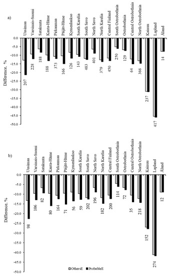 Differences in (a) bilberry and (b) cowberry yields in OthersE and ProbableE compared to WRE in different provinces in Finland. The numbers above/below the bars represent the estimated bilberry and cowberry yields (million kg year−1) in forest land in each province in WRE in 2016–2025.