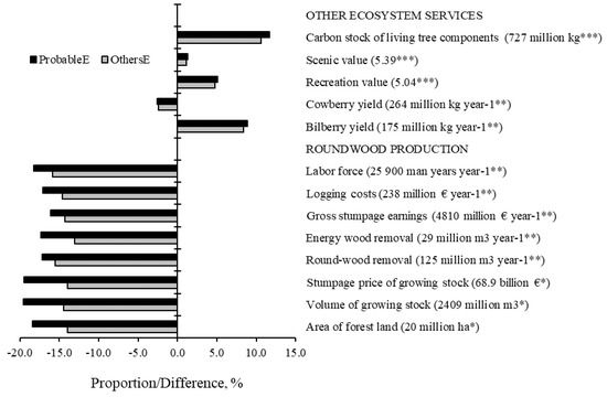 In Finland, the total volume of the growing stock on forest land was 2409 million m3 in 2016, and in OthersE, 5% of this was under restricted forest management and 9% on protected forest land. In ProbableE, these proportions were 10% and 9%, respectively. In all provinces, the proportion of volume was higher in the area with restrictions on forest management than that of area with restrictions on forest management in OthersE and ProbableE (compare Figure 2a,b). The stumpage price of the growing stock on protected forest land was EUR 6.1 and 6.2 billion in OthersE and ProbableE, respectively.
