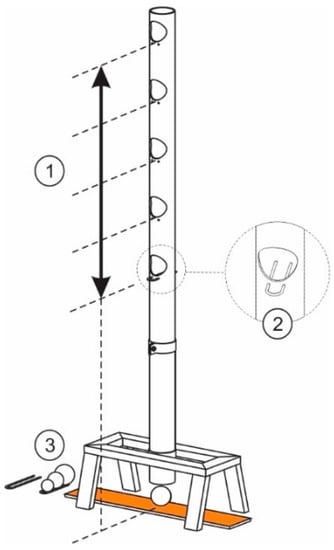 To carry out each impact test, flooring specimens were placed on a completely rigid surface and anchored to it by clamps placed on the perimeter, avoiding any influence of the support on the deformation behaviour. Later, each ball was dropped from each of the reference heights on one of the test specimen, using an auxiliary metallic instrument to guarantee the test conditions (precise height reference, and initial velocity V0 = 0 m/s), Figure 2.