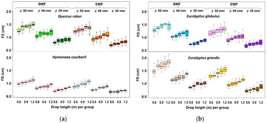 In accordance with Table 5, post-hoc pairwise comparisons showed that there was a significant difference between H. courbaril with the rest of the wood species in all possible test conditions (drop height and Φ ball). Moreover, lower FD values were always shown. On the other hand, E. grandis is the species that shows the highest FD values in the vast majority of test conditions. Finally, the similar behavior of the Q. robur and E. globulus species is worth noting, which in most cases does not show significant differences.