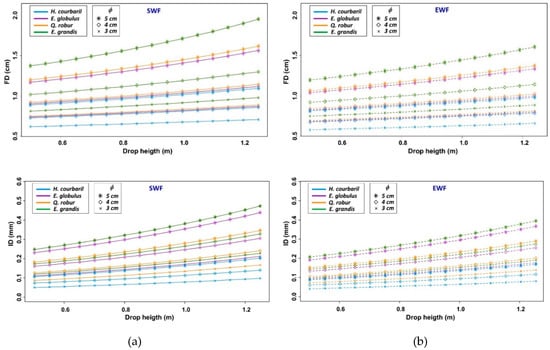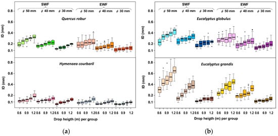 Box plot graphics: indentation depth (ID) for each wood specie. Different flooring types (solid wood flooring (SWF) and engineered wood flooring (EWF)), drop heights (0.60–0.75–0.90–1.05–1.20 m) and diameter balls (30–40–50mm) were represented. (a) traditional hardwood species applied on wood flooring; (b) fast-growing hardwoods.