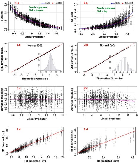 The marginal model plots proposed by Cook and Weisberg [] are variations on the basic residual plots, Figure 5a. These plots all have the response variable on the vertical axis, while the horizontal axis is provided in turn by each of the numeric predictors in the model and the fitted values. This marginal model can reproduce non-linear marginal relationships for the predictors. Indeed, the model, as represented by the red dashed lines, does a fairly good job of matching the marginal relationships represented by the blue solid lines. Figure 5b depicts the normal probability plots of the deviance residual. Normality (approximate normality) is in the deviance residuals, which allows us to evaluate how well satisfied the assumption of the response distribution is. This normality can be contrasted by the frequency histogram and it must fit the normal distribution. Plots of the deviance residuals against the linear predictors, Figure 5c, showed that no pattern indicates any problem with the variance function. The observed (in the y-axis) vs. predicted (in the x-axis) plot (OP), Figure 5d, is visual and immediately representative to understand the model global accuracy for both variables, FD and ID.