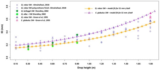 Model validation was carried out, checking the model with external bibliographic data. Almahallawi [] worked with oak wood samples according to ASTM D2394-17 standard dropping ball of 51 mm diameter from 0.15 to 1.80 m of height, repeating test 4 for each height. The ID values for 51 mm diameter of Quercurs robur solid wood floor type compared with the proposed model line are displayed in Figure 7. The ID value variability was similar to that found in this work. Adjustment response was more acceptable than basic lineal regression (R2 = 64.83% and 62.03%, respectively) and with better general adjustment in the model analysis. Likewise, this author presented oak wood samples finished with polyurethane values and he did not find differences with oak wood samples without surface treatment. Additionally, these values were consistent with his proposed model, Figure 7. In other research, Shendley [] presented ID values to Quercus alba and Q. kelloggii with three drop heights: 0.3, 0.6 and 0.9 m. In correspondence with Quercurs robur botanical closeness, these values were included in the comparative representation. As expected, Q. alba and Q. kelloggii had similar behavior to Q. robur (Figure 7). In a similar research line, Green et al. [] received ID values to E. globulus and Q. robur with extrapolated values of 1.80 m of height from lineal regression. These values were incorporated into this model and were consistent with it (Figure 7).