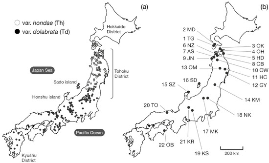 (a) Classical distribution range of genus Thujopsis defined by morphological differences between varieties shown in Kurata [9], var. dolabrata (Td, black dots) and var. hondae (Th, white dots). (b) Locations of the 22 sampled populations. Numbers correspond to the population numbers in Table 1.