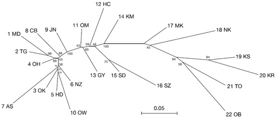 The genetic relationships among the populations were evaluated by constructing a neighbor-joining tree [29] using Poptree2 web [30,31]. Nei’s chord distance (Da) [32] was used to estimate the degree of genetic divergence of the populations. The node significances of the trees were evaluated using bootstrap probabilities based on 1000 replicates.