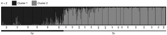 According to clustering analysis in STRUCTURE, the cluster number (K) was 2 (Figure A3). The distribution of populations for the two clusters was found to be geographically structured between the populations along the distribution regions (Figure 3). The proportion of cluster 1 was much higher in the Td distribution region, while that of cluster 2 was much higher in the Th region. Although the MK and NK populations were located in the Td region, individuals of these two populations belonged to both clusters 1 and 2.