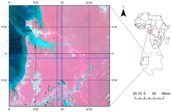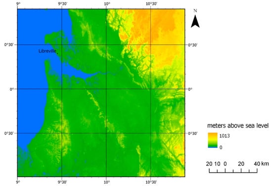 The study was conducted over the area of around 40,000 km2 covering by four Sentinel-2 scenes called granules. The study area is predominantly covered by different forest types: mangroves, freshwater swamp forest, lowland forest, semi-evergreen moist forest disturbed natural forest [18]. The terrain is a combination of the coastal sedimentary plain and the hilly Cristal mountains with the highest peak—The Ndjolé Mounts located 1022 m above sea level (Figure 2). The landscape is cut by large number of rivers.