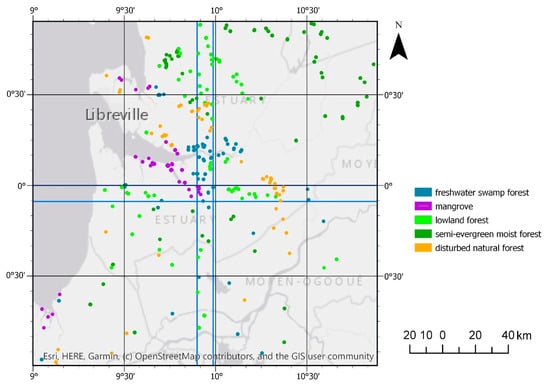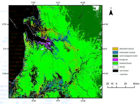 The five forest types were identified in the study area: mangroves, freshwater swamp forest, lowland forest, semi-evergreen moist forest and disturbed natural forest. A mangrove forest occurs generally along coasts in or near brackish or salt water, freshwater swamp forest covers waterlogged areas located below 1200 m above sea level. A lowland and semi-evergreen moist forest also occurs below 1200 m above sea level but the lowland forest is characterized by little or no seasonality compared to the evergreen broadleaf and semi-evergreen moist forest, which shows seasonality of flowering and fruiting [18]. A disturbed natural forest refers to the forest disturbed by, for example land clearing, fire, or road construction. The names of the forest type classes followed the definitions of the forest classes developed by the Convention on Biological Biodiversity. The reference samples for the forest type were identified based on the photointerpretation of Sentinel-2 images supported by analysis of GlobCover 2009, Global Forest Watch and Global Forest Change and local knowledge of the study area. The Global Forest Watch was particularly useful to accurately locate the mangrove forest, while the Global Forest Change database was used to the greatest extent in determining the location of a disturbed natural forest.