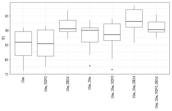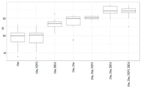 By contrast, adding the NDVI index to the combination of 10 m bands caused a slight increase in F1 from 0.2 to 0.5 percentage points. However, the NDVI added to the combination of 10 m and 20 m bands decreased the median F1 value by 1 percentage point. Interestingly, adding NDVI to the combination of 10 m, 20 m and DEM resulted in a deterioration of the accuracy by 3 percentage points. The low importance of the NDVI has been reported by other researchers for tree species classification in New Caledonia [37] and the mapping of tropical forest changes in Brazil [31].