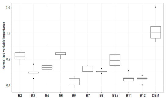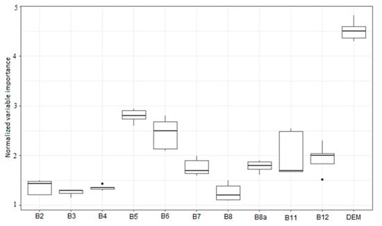 The analysis of the normalized variable importance for the most accurate classification of the forest cover revealed that the DEM contributed the most to the classification (Figure 5). Among the Sentinel-2 bands, the red-edge B5 (20 m spectral resolution), followed by B2 (10 m) and red-edge B8a (20 m) were the most important variables. Interestingly, B5 showed the smallest spread of variable importance values. The least important were the SWIR bands: B11 and B12, as well as the red-edge B6.