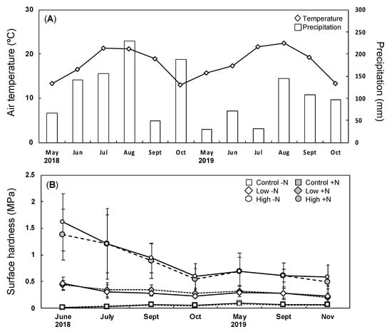 Meteorological and soil conditions at the study area. (A) The meteorological conditions in each month; Diamond: mean air temperature; Bar: total precipitation. (B) The seasonal changes in average surface SH ± standard error (SE); square: control; diamond: low compaction level; circle: high compaction level; white: non-N loading (−N); gray: N loading (+N). (n = 5).
