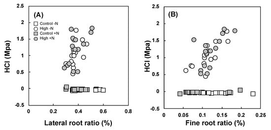 Relationships between (A) lateral root proportion and (B) fine root proportion and HCI (n = 5). Circle: control; square: high compaction; white: no N loading (−N); gray: N loading (+N).