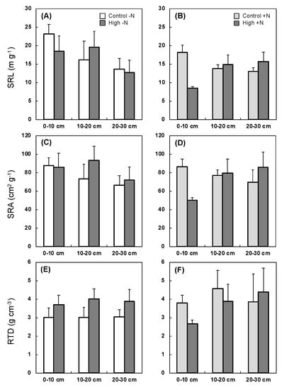 Mean value ± SE in specific root length (SRL), specific root area (SRA), and root tissue density (RTD) (n = 5). The responses were showed without N loading (A,C,E) and with N loading (B,D,F). White and light gray: no compaction; dark gray: high compaction.