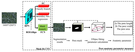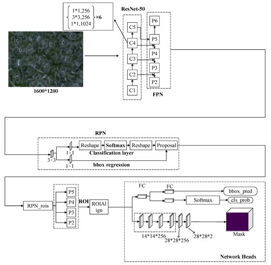 In this work, a Mask R-CNN based on deep learning was used to detect and segment the stomatal pores of a microscope image of black poplar. The Mask R-CNN is a two-stage instance segmentation algorithm (where the first stage is a region proposal that judges whether a positive object exists or not and the second stage predicts the category of the object that is output from the first stage and describes their masks) and is composed of the following four modules, whose network architecture is shown in Figure 5.
