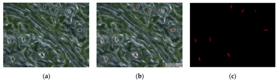 An example of manually labeled results: (a) original stomatal image, (b) mask overlaid on the original image, and (c) the labeled mask image (red is the mask area of the pore and black is the background).