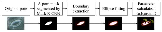 The pore measurement algorithm consists of mask contour coordinate extraction, ellipse fitting, and parameter calculation. The pore parameter measurement process is shown in Figure 6.