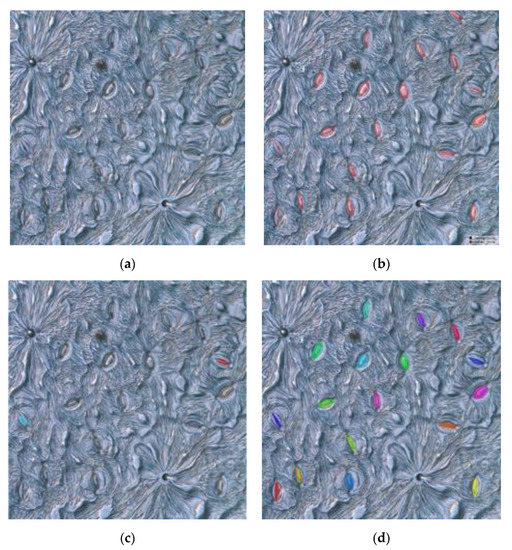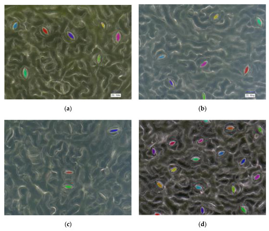 Examples of the detection and segmentation results of the proposed method are shown in Figure 7. As can be seen in Figure 7, the proposed method achieved a good performance regarding the detection and segmentation of stomatal pores. We randomly divided the training and test sets into 10 subdatasets, used nine subdatasets to train the model, and used the rest of the subdataset for testing. Through the statistical analysis of 188 test images and after 10-fold cross validation, an average of 2201 stomata were detected from an average of 2278 stomata marked by the proposed method. In order to quantitatively analyze the validity and feasibility of the proposed model, the areas corresponding to stomatal pores were manually labeled using the LabelMe [35] marking tool under the guidance of botanical experts, and the obtained results were used as the ground truth (GT). The annotation results were compared with the measured results obtained by the proposed method. The average precision was 96.72%, the average recall rate was 96.87%, and the average IoU of the pore was 0.82. The average time to process an image was about 912 ms. The complete code for the project can be accessed at https://github.com/lijunyu159/stomatal_pore_measurement-MaskRCNN (accessed on 15 July 2020).