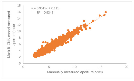 The scatterplot of the automatically quantified stomatal apertures versus the manually quantified apertures.