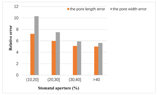 In addition, the relationship between the stomatal aperture and the measurement error was analyzed. Based on 10-fold cross validation, the number of pores with a stomatal aperture larger than 40% was an average of 469, that larger than 30% and less than 40% was an average of 954, that larger than 20% and less than 30% was an average of 646, and that larger than 10% and less than 20% was an average of 91. The relationship between the degree of stomatal opening and the average measurement error is shown in Figure 9. It can be seen that the accuracy of measurement results was proportional to the degree of stomatal opening.