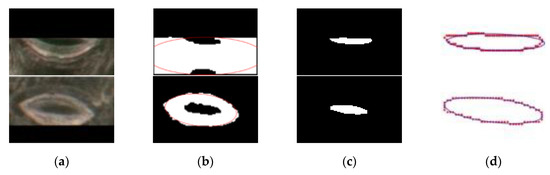 Comparison of different segmentation methods. Top row: the condition one. Bottom row: the condition two. (a) The original image, (b) an example of failed segmentation using Li’s methods, (c) segmentation results of the proposed method, and (d) the ellipse fitting results of the proposed method.
