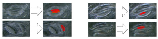In addition, the proposed method incorrectly identified non-stomatal pores as pores due to the influence of guard cells and leaf background colors in the microscope images of living plant leaves, as shown in Figure 15, thus reducing the precision rate of the proposed method.