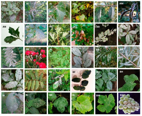 Symptoms of powdery mildew infection on hosts examined in our survey cross-referenced to lists of hosts and powdery mildews in Table 1: A—Acer campestre L. (MM), B—Acer negundo L. (BM), C—Acer platanoides L. (MM), D—Acer tataricum L. (BM), E—Aesculus × carnea Zeyh. (MM), F—Aesculus hippocastanum L. (BM), G—Alnus glutinosa (L.) Gaertn. (MM), H—Amelanchier alnifolia (Nutt.) Nutt. ex M. Roem. (MM), I—Amelanchier ovalis Medik. (BM), J—Berberis vulgaris L. (BM), K—Betula pendula Roth (BM), L—Caragana arborescens Lam. (BM), M—Carpinus betulus L. (BM), N—Catalpa bignonioides Walter (VP), O—Cornus mas L. (BM), P—Cornus sanguinea L. (BM), Q—Corylus avellana L. (AV), R—Crataegus monogyna Jacq. (BM), S—Deutzia scabra Thunb. (BM), T—Euonymus europaeus L. (MM), X—Euonymus fortunei (Turcz.) Hand.-Mazz. (MM), Y—Fagus sylvatica L. (BM), Z—Forsythia × intermedia Zabel (VP), AA—Frangula alnus Mill. (MM), AB—Fraxinus excelsior L. (BM), AC—Ligustrum vulgare L. (BM), AD—Lonicera periclymenum L. (BM), AE—Lonicera tatarica L. (VP), AF—Lycium barbarum L. (EK), AG—Mahonia aquifolium (Pursh) Nutt. (BM), AH—Mahoberberis × neubertii C. K. Schneid. (VP), AI—Malus domestica Borkh. (BM), AJ—Platanus × hispanica Münchh. (MM), AK—Populus tremula L. (BM), AL—Prunus insititia L. (MM), AM—Prunus persica (L.) Batsch (BM), AN—Quercus petraea (Matt.) Liebl. (BM), AO—Quercus robur L. (BM), AP—Ribes uva-crispa L. (BS), AQ—Ribes uva-crispa (BM), AR—Robinia pseudoacacia L. (BM), AS—Rhododendron sp. L. (BM), AT—Rhus typhina L. (BM), AX—Rosa multiflora Thunb. (BM), AY—Rosa pendulina L. (MM), AZ—Salix caprea L. (BM), BA—Salix daphnoides Vill. (BM), BB—Salix purpurea L. (AL), BC—Sambucus nigra L. (MM), BD—Sorbus aucuparia L. (BM), BE—Spiraea japonica L. (MM), BF—Symphoricarpos albus (L.) S.F.Blake (MA), BG—Syringa vulgaris L. (BM), BH—Syringa josikaea J.Jacq. ex Rchb.f. (BM), BI—Ulmus minor Mill. (MM), BJ—Viburnum lantana L. (BM), BK—Viburnum opulus L. (BM), BL—Vitis amurenensis Rupr. (BM), BM—Vitis vinifera L. (BM), BN—Vitis vinifera (VP). Photo: AL—Aleš Lebeda, AV—Abigail Vrbovská, BM—Barbora Mieslerová, BS—Božena Sedláková, EK—Eva Křístková, MA—Marie Ascherová, MM—Markéta Michutová, VP—Veronika Petřeková.