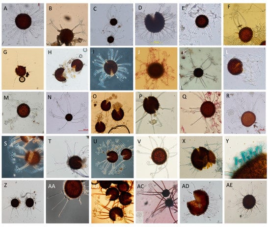 Variability of chasmothecia of selected species: A—Erysiphe adunca var. adunca (Salix caprea, VP), B—Erysiphe alphitoides (Quercus robur, BM), C—Erysiphe arcuata (Carpinus betulus, VP), D—Erysiphe azaleae (Rhododendron sp., MS), E—Erysiphe berberidis var. berberidis (Berberis vulgaris, MM), F—Erysiphe berberidis (Mahonia aquifolium, VP), G—Erysiphe elevata (Catalpa bignonioides, MM), H—Erysiphe euonymi (Euonymus europaeus, MM), I—Erysiphe flexuosa (Aesculus × carnea, JD), J—Erysiphe grossulariae (Ribes uva-crispa, VP), K—Erysiphe lonicerae var. ehrenbergi (Lonicera tatarica, VP), L—Erysiphe necator (Vitis vinifera, VP), M—Erysiphe ornata var. europaea (Betula pendula, VP), N—Erysiphe palczewskii (Caragana arborescens, VP), O—Erysiphe penicillata (Alnus glutinosa, VP), P—Erysiphe platani (Platanus × hispanica, MM), Q—Erysiphe prunastri (Prunus insititia, MM), R—Erysiphe syringae (Ligustrum vulgare, VP), S—Erysiphe syringae (Syringa josikaea, JD), T—Erysiphe tortillis (Cornus mas, MS), U—Erysiphe vanbruntiana var. sambuci-racemosae (Sambucus racemosa, MS), V—Erysiphe ulmi (Ulmus minor, MM), X—Phyllactinia guttata (Corylus avellana, AV), Y—Phyllactinia guttata (penicillate cells, Corylus avellana, AV), Z—Phyllactinia fraxini (Fraxinus excelsior, JD), AA—Phyllactinia orbicularis (Fagus sylvatica, MS), AB—Podosphaera amelanchieris (Amelanchier ovalis, MM), AC—Podosphaera myrtillina (Vaccinium myrtillus, MZ), AD—Sawadaea bicornis (Acer platanoides, MK), AE—Sawadaea tulasnei (Acer tataricum, JD). Photo: AV—Abigail Vrbovská, BM—Barbora Mieslerová, JD—Jitka Dvořáková, MM—Markéta Michutová, MS—Michaela Sedlářová, VP—Veronika Petřeková.