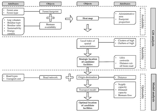 The research applies a two-step DSS to optimize the location of bioenergy facilities. The first step of the DSS is a GIS-based analysis to identify strategic facility locations based on the availability of forest biomass and the suitability of a strategic location for bioenergy conversion. The second step is a transportation model analysis to identify optimal facility locations. An overview of the objects and attributes for strategic and optimal facility locations are presented in Figure 1.