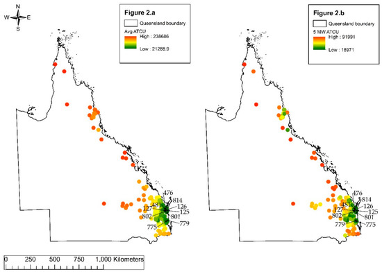 In the base case situation, the forest biomass quantities are calculated according to a previous study [43], and an assumption based on harvested log volumes in the state of Queensland. The estimated availability of the biomass already captures losses of biomass due to sustainable and technical restraints. However, it is unlikely that the remaining biomass will all be harvested and transported, or solely used for bioenergy purposes. Paper industries, horticulture or pellet exports will result in a reduction in forest biomass that will not be available for the Australian energy market [52]. To consider that less than 100% of the forest biomass will be converted to bioenergy in Queensland, several lower biomass availability scenarios are established and compared with the base case where 100% availability was used. The effect of reduced availabilities from 100% to 50% is tested on ATCUj and ATDUj with decrements of 10%. The reduced availability is defined as parameter Qi in Equations (2) and (3) of the transportation model. The sensitivity is only tested for the ten best performing facility locations and compared with the results of the base case in model analysis. The ATCUj and ATDUj are only calculated for capacities of 5, 10, 15 and 20 MW.