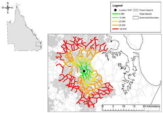 For the model analysis, a total of 128 demand points or strategic facility locations, 80,920 forest supply points and the Queensland road network are combined to calculate the shortest path distance using the Origin-Destination Cost Matrix in ArcGIS [45,63]. The quantity Qi of forest biomass available in megawatts (MW) at each supply point is determined in the availability study using the data described in [43]. The results of the transportation cost model are analysed using What’sBest! Version 16.0 (LINDO Systems Inc., Chicago, IL, USA) [64].