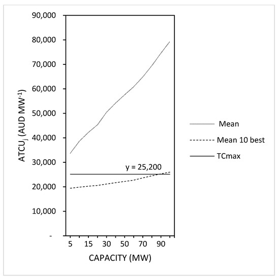 In Figure 4, the maximum transport cost calculated in Table 2 for the base case scenario is compared to the mean of ATCUj values (J = 128) from the foregoing analysis (Table 1). For further comparison, the mean ATCUj of the ten (J = 10) best strategic locations (Figure 2) for each capacity is added to Figure 4. From the graph, it appears that, based on the calculated average, the 10 best locations remain under the maximum transport cost threshold (y = 25,200). Only at capacities above 90 MW does the curve exceed TCmax. On the other hand, the mean of all strategic locations exceeds TCmax at every capacity. This indicates that the average facility location in Queensland would not be profitable. However, in Table 3, the number of locations with ATCUj under TCmax are calculated and more detail indicates that, especially at lower capacities, a large set of locations can be feasible.