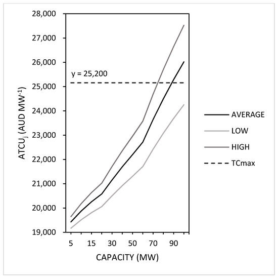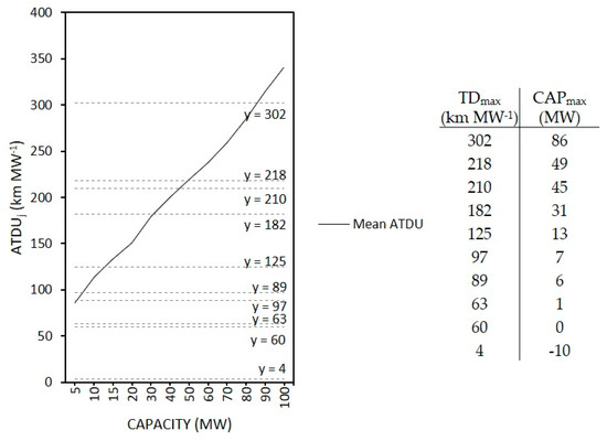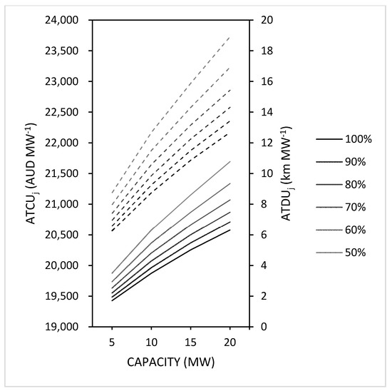 Both Equations (9) and (10) will be used to substitute cij in Equation (3) of the transportation model for the calculation of ATCUj and ATDUj. The sensitivity is only tested for the ten best-performing facilities and compared with the results of the base case in model analysis. The ATCUj and ATDUj are calculated for capacities ranging between 5 and 100 MW.