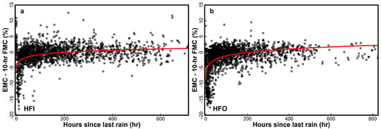 Fitted relationships (red curves) between the number of hours since the last rain and the difference between equilibrium moisture content (EMC) and 10-h fuel moisture content (10-h FMC) for two sites (a for HFI and b for HFO). A test dataset was used for plotting (see Section 2.4).