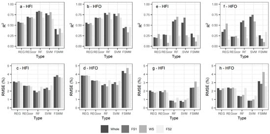 MML showed the best fitness among the three model types for both sites, and RF showed slightly better performance than SVM for most cases (Figure 4a–d). In HFI, the whole-year model’s R2 was 0.82 for RF and 0.78 for SVM. RMSE was 2.05% for RF and 2.27% for SVM. Like MREG, there was a small decrease in the fitness in HFO. R2 was 0.79 for RF and 0.77 for SVM. RMSE was 2.69% for RF and 2.84% for SVM. The model’s estimates of the 10-h FMC and observations showed a strongly bound time series pattern (Figure 6). The estimates were generally akin to observations, while there were underestimations for the high 10-h FMC.