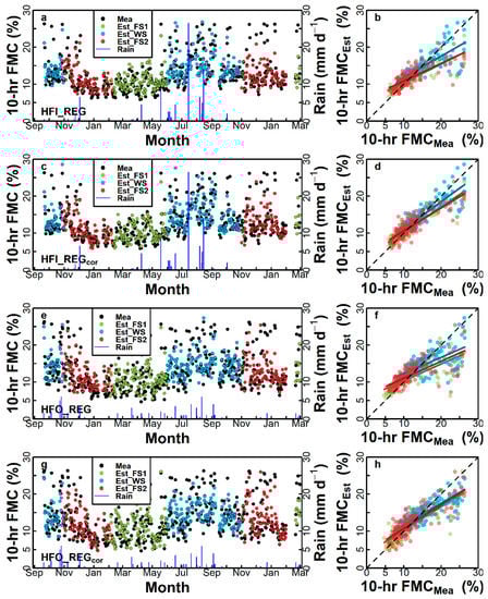Time series and scatter plots comparing measurements (Mea) and estimates (Est) of 10-h fuel moisture content (10-h FMC) at HFI (a–d) and HFO (e–h) for each season: regression models (MREG). FS1 refers to February through May; WS, to June through October; and FS2, to November through January. To greatly reduce the number of data points appearing on the graph, daily mean 10-h FMC values of the test dataset were used.