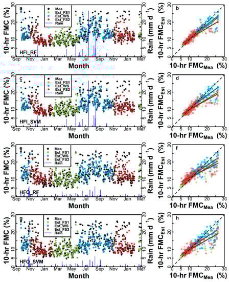 Time series and scatter plots comparing measurements (Mea) and estimates (Est) of 10-h fuel moisture content (10-h FMC) at HFI (a–d) and HFO (e–h) for each season: machine-learning models (MML). FS1 refers to February through May; WS, to June through October; and FS2, to November through January. To greatly reduce the number of data points appearing on the graph, daily mean 10-h FMC values of the test dataset were used.
