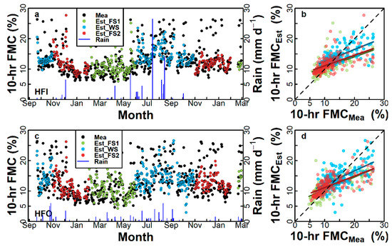 Time series and scatter plots comparing measurements (Mea) and estimates (Est) of 10-h fuel moisture content (10-h FMC) at HFI (a,b) and HFO (c,d) for each season: a process-based model (MFSMM). FS1 refers to February through May; WS, to June through October; and FS2, to November through January. To greatly reduce the number of data points appearing on the graph, daily mean 10-h FMC values of the test dataset were used.