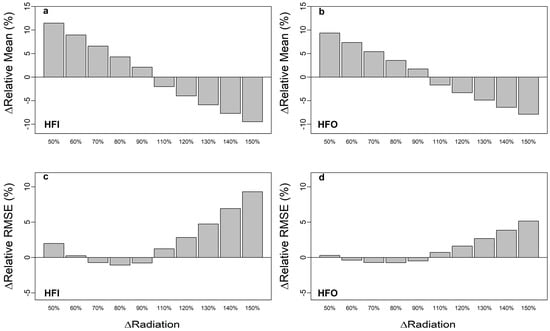 Results showing the sensitivity of 10-h fuel moisture content (10-h FMC) estimates obtained by the fuel stick moisture model (FSMM) to changes in shortwave downward radiation input for HFI (a,c) and HFO (b,d). “Relative” stands for the ratio of the difference in the statistics (a,b: mean and c,d: RMSE of 10-h FMC estimates) between estimates with 100% radiation and those with varied radiation to the statistics with 100% radiation. A positive y-value in each subplot indicates the increase in the relative statistics (i.e., relative mean and relative RMSE) compared to that with 100% radiation input.