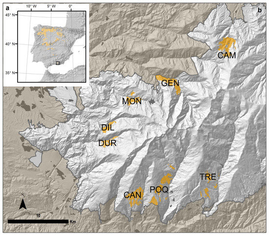 Figure 1. Distribution of Quercus pyrenaica forests in the Iberian Peninsula (a) and location of the patches in Sierra Nevada mountain range (b)—the name of each population as in Table 1.