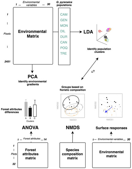Figure 2. Methodological scheme of the analyses. Using an environmental data matrix, the main environmental gradients that characterize the oak forests at Sierra Nevada were identified using a Principal Component Analysis (PCA). Linear Discriminant Analysis (LDA) was also applied to identify different groups of oak populations. With a matrix of floristic composition, a Non-metric Multidimensional Scaling (NMDS) ordination were applied to visualize patterns of species composition, interpret them according to the environmental factors, and identify groups of oak populations based on similarities between floristic composition. See Materials and Methods for more details.