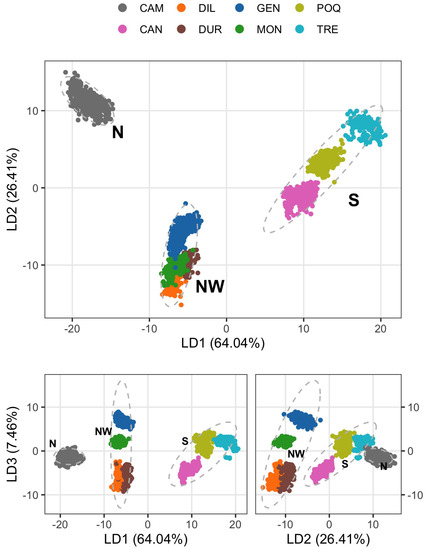 Figure 3. Discriminant analysis ordination of Quercus pyrenaica populations. N: northern population group (CAM); NW: northwest population group (GEN, MON, DUR, DIL); and S: southern population group (CAN, POQ, TRE). Population’s code as in Table 1. Numbers in brackets expressed explained variance (%) for each discriminant axis.