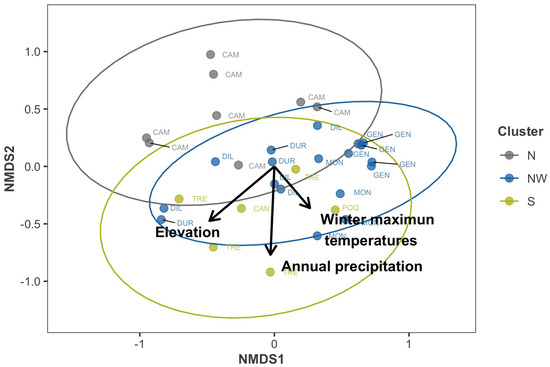 Figure 4. NMDS ordination of the plots. Points represent plot sites displayed according to their similarity in species composition. Proximity in the statistical space indicates plot sites with a similar species composition. Arrows represent vectors of significantly environmental variables explaining the ordination (see Table 5). Each plot was colored according to the three oak-populations’ clusters derived from discriminant analysis. Only two dimensions of the NMDS are illustrated for ease of representation.