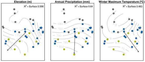 A three-dimensional solution of the NMDS was chosen because its correlation with the original data was higher than for a two-dimensional solution (Linear fit R 2 = 0.793 vs. 0.713). Additionally, lower Kruskal’s stress value was observed for the three-dimensional solution (Stress = 0.159 vs. 0.226). The NMDS ordination of the forest stands according to their floristic composition was significantly correlated with precipitation variables, elevation, and marginally with winter maximum temperatures (Figure 4; Table 5). The precipitation variables showed highly and negative correlations with NMDS axis 2 (Table 5). The NMDS axis 1 were negatively correlated with elevation ( R 2 = 0.464) and minimum temperatures, and positively correlated with slope and winter maximum temperatures (Table 5). The NMDS ordinations with fitted vectors and surfaces for significant variables are shown in Figure 5. All of these variables showed a nonlinear significant relationship with the ordination pattern ( R 2 values for surfaces were slightly higher than linear R 2 values; Table 5).