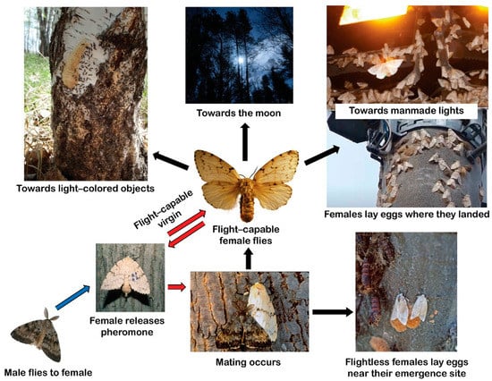 The role of the Allee effect may be diminished when flight-capable females are present. Flight-capable females fly to lights (the moon or manmade light sources) or light-colored surfaces to lay their eggs. Virgin females fly less frequently than mated females, as they call for a mate first [] (Figure 2). However, virgins that are not mated quickly will eventually fly to another location, to call for a mate. Since both sexes are attracted to lights, virgin females may be increasing their chances of finding a mate by flying to nearby light sources, where males will also congregate []. Once mated, females fly and congregate near lights, to lay their eggs, effectively creating local concentrations of flight-capable individuals. These concentrations could be within an already infested area with mixed-flight individuals, or out ahead of the generally infested area, if moving into new habitats. These local concentrations could then coalesce and increase the rate of expansion just as the small populations ahead of the leading edge in flightless female populations increase the speed of invasion into new areas. With flighted females, however, the number of these small populations outside the generally infested area could be higher, and they could be further from the leading edge of the infestation. There has been evidence of this already occurring when it was observed that female flight capability was maintained at higher levels (even up to 70%) than random mating within European populations where flighted types and non-flighted types were sympatric []. When individuals from populations with flight-capable females are mated with individuals from populations where females were flightless, the first-generation females are only capable of a descending glide, and only about 15% of the female progeny of matings between the hybrids are capable of strong directed flight [].
