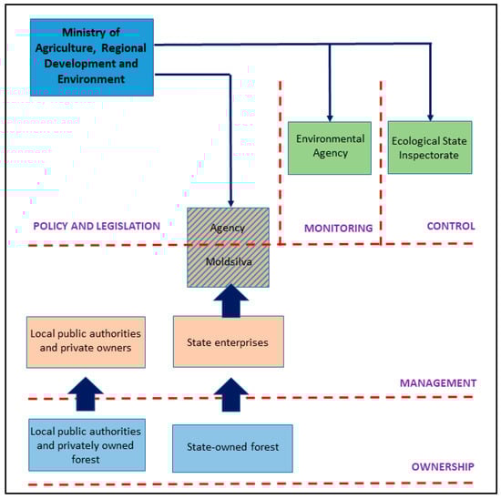 The current forest institutional framework in the country (Figure 1) includes the Ministry of Agriculture, Regional Development and Environment (MARDE); Environmental Agency; Ecological State Inspectorate; Moldsilva Agency (Moldsilva); State Forest Enterprises (SFE); and LPAs owning forests. MARDE is responsible for developing policies and regulations []. MARDE is an umbrella organization comprising a number of subordinated institutions: (1) Moldsilva, in charge of forest policy enforcement []; (2) the Environmental Agency, issuing authorizations for the use of natural resources []; and (3) the Ecological State Inspectorate, enforcing environmental legislation []. LPAs have legal obligations towards the management of their own forests [], but there is no clear separation between their attributions and Moldsilva’s factual mandate over the communal forests []. The management function of the state is carried out by 25 legally independent SFEs that form a network of territorial state-owned entities managing all state public forests. Communal forests are unequally managed, only some of them by municipal enterprises specialized in providing forest management services, among other public services []. Moldsilva is a self-financed (There is some budgetary allocation for Moldsilva, but they are rather small, not exceeding 3% of Moldsilva’s budget [].) state agency, in charge, among other prerogatives, of SFE coordination and policy enforcement as well as other extension services for all interested in managing or creating forests. Although in the case of Moldsilva, there is a clear overlap between the regulatory and management functions [], its mandate includes significant involvement in policy elaboration, making Moldsilva more of an authority institution than a management institution.